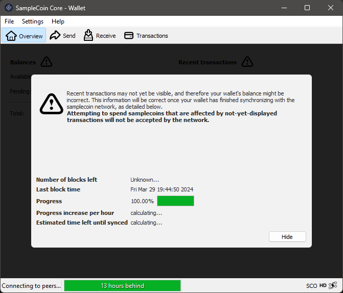 Tu billetera, cada vez que se abre, intenta conectarse a los otros "nodos" de la red para sincronizar datos de la blockchain. Esta ventana se mantendrá abierta e inmóvil, sin poder sincronizar, en dos situaciones: