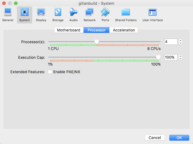 Settingsbutton, then go toSystemtab andProcessorsub-tab. Increase the number of processors to the number of cores on your machine if you want builds to be faster.